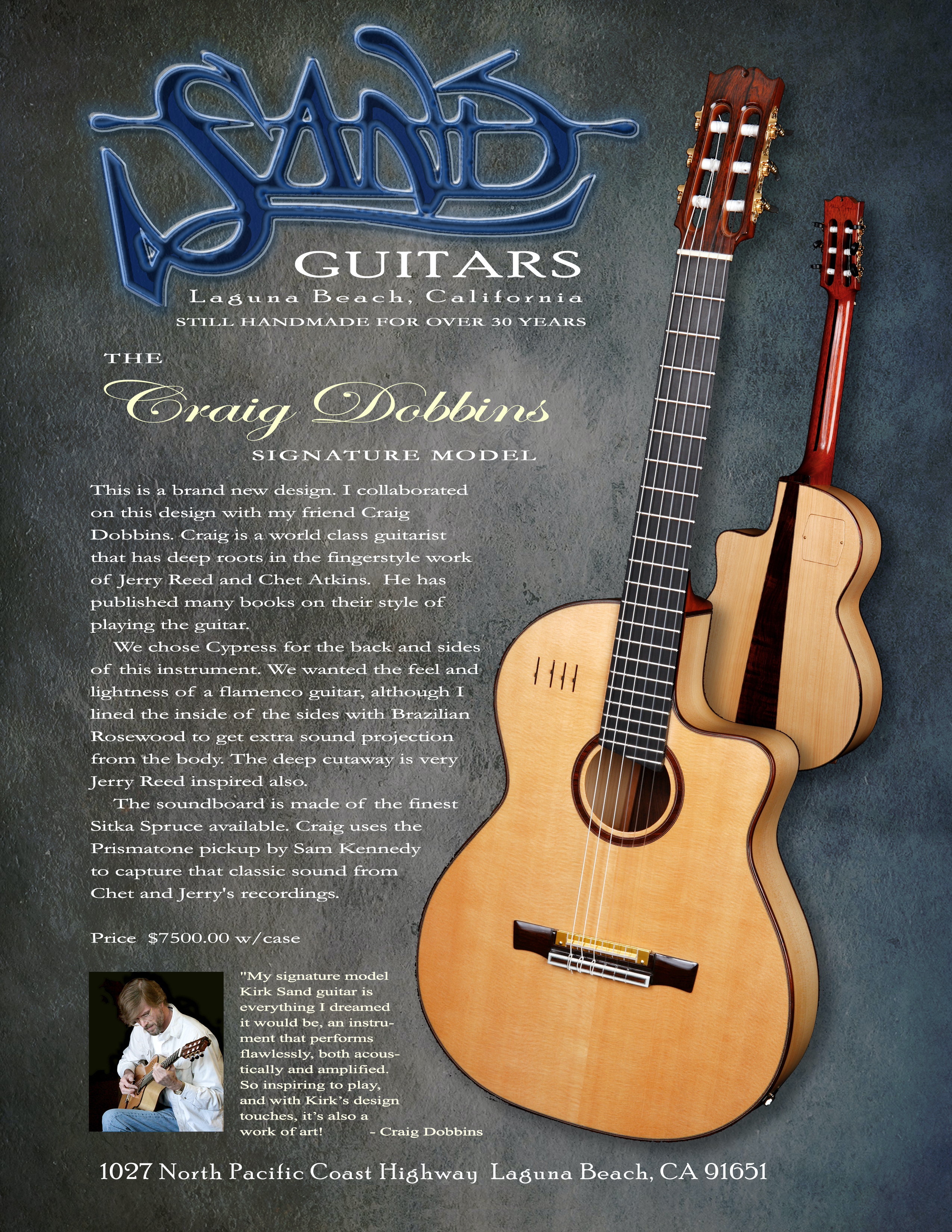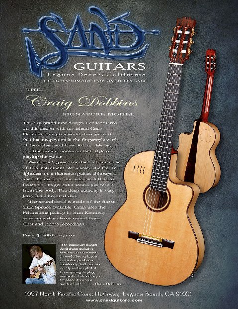 In 2013, acclaimed guitar maker Kirk Sand introduced the Craig Dobbins Signature Model acoustic/electric nylon string guitar.