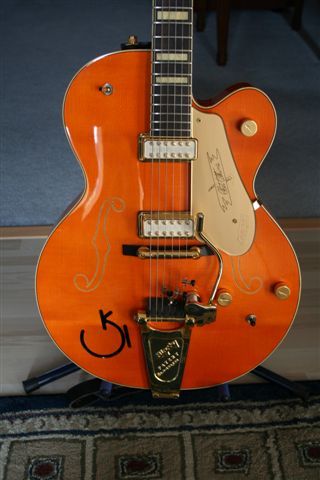 It's a reproduction of Chet's one-of-a-kind solid top 6120, which he used on classic 1950's albums like Fingerstyle Guitar. Paul Yandell and the folks at Gretsch have been working hard to get everything as close as possible to Chet's guitar, including the Ray Butts designed pickups (re-created by TV Jones) and the stereo wiring. (That's right, stereo. You can send the treble and bass strings to separate channels or effects.)